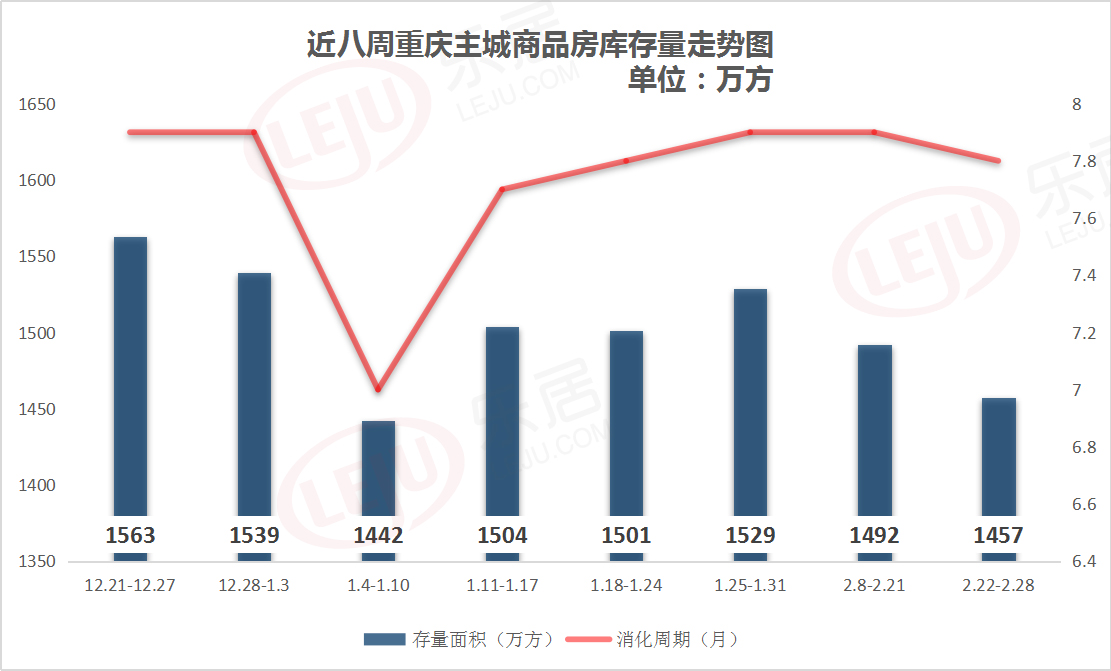 庫存量方面(miàn),截至2月28日,重慶主城區商品房庫秒生存量為1457萬方,去化周期縮短,為7.8個月。